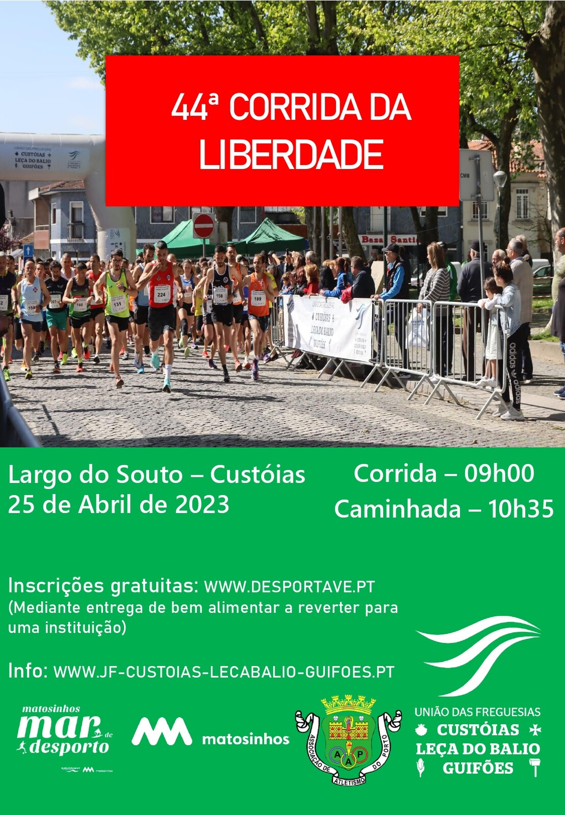 No âmbito das comemorações do 49.º aniversário do 25 de Abril, promovidas pela Junta da União das Freguesias de Custóias, Leça do Balio e Guifões, irá realizar-se no Largo do Souto, em Custóias, Matosinhos, a 44.ª edição da Corrida e Caminhada da Liberdade, uma das mais antigas competições deste género em Portugal.