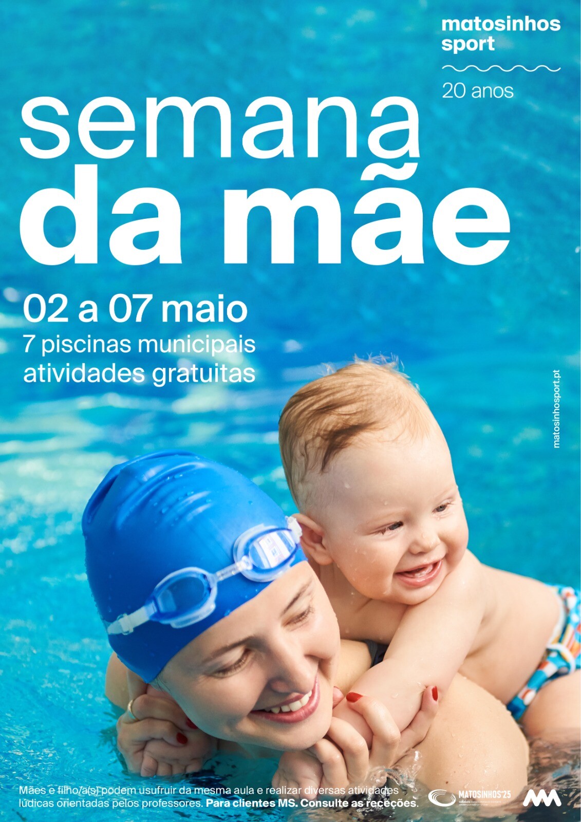 No âmbito do 20° aniversário da Matosinhos Sport, cujos festejos terão lugar até ao final do ano, podes durante a semana do "Dia da Mãe", de 2 a 7 de maio, frequentar gratuitamente, e em cada uma das 7 piscinas municipais, atividades lúdicas para mães e filhos/as em conjunto.