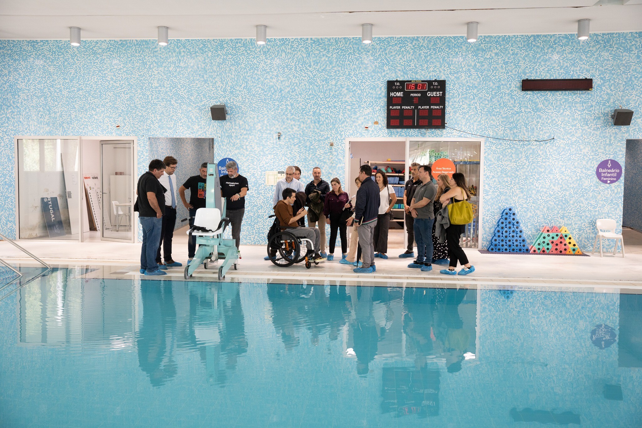 O ‘Passeio das Acessibilidades’ continuou com um percurso pedonal até à Piscina da Senhora da Hora com o objetivo de analisar e observar as melhorias implementadas nas condições de acessibilidade no interior deste equipamento, nomeadamente, no acesso ao tanque da piscina municipal, melhoria essa executada nas sete piscinas municipais do concelho.