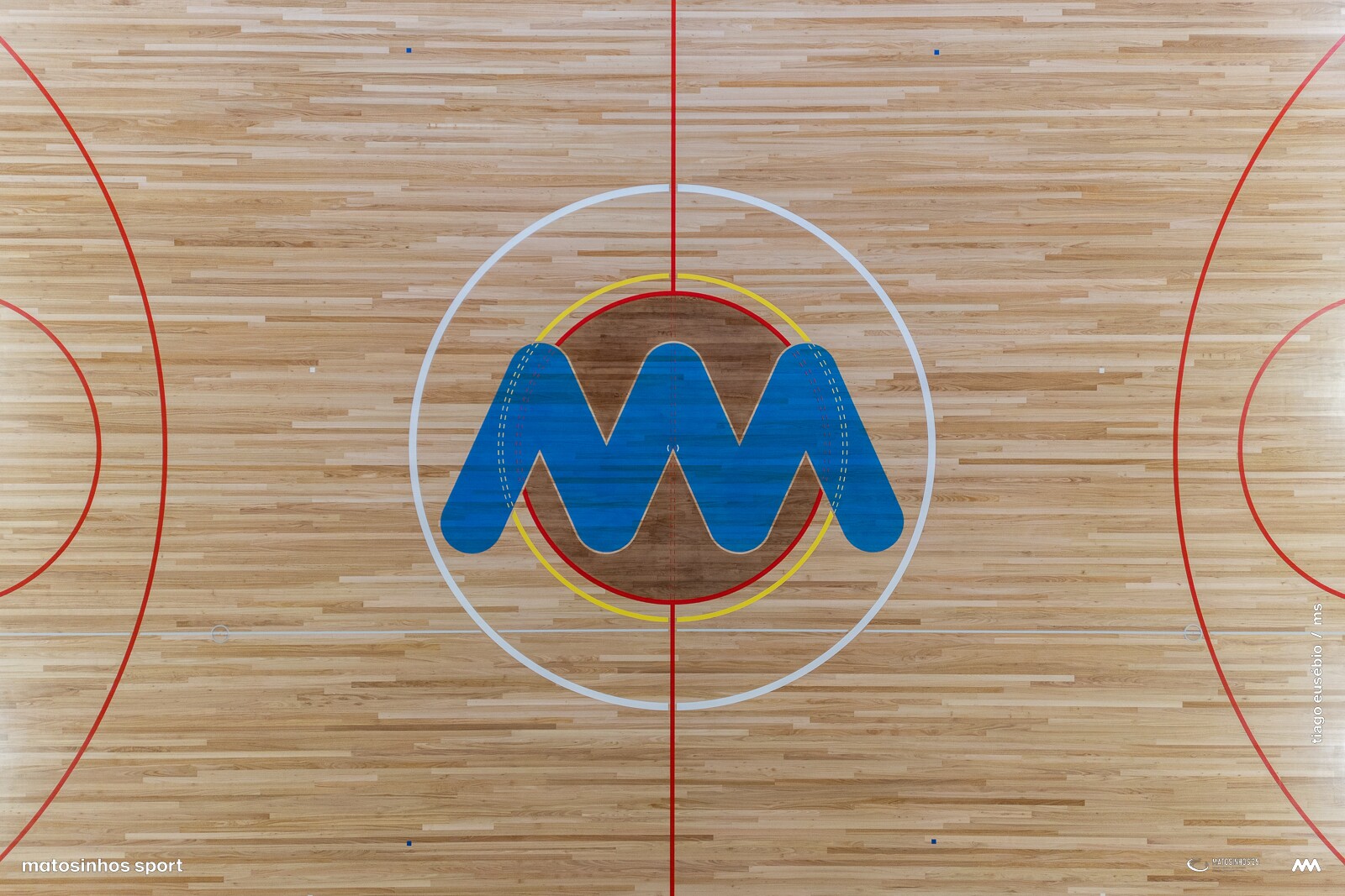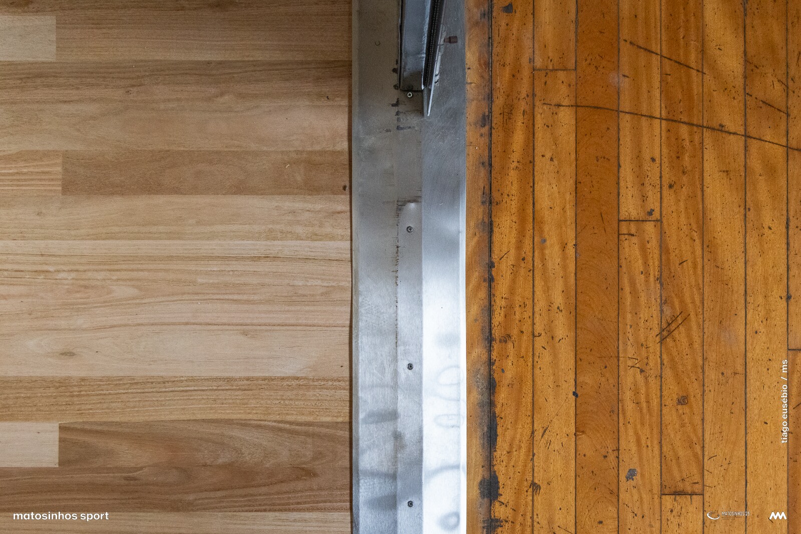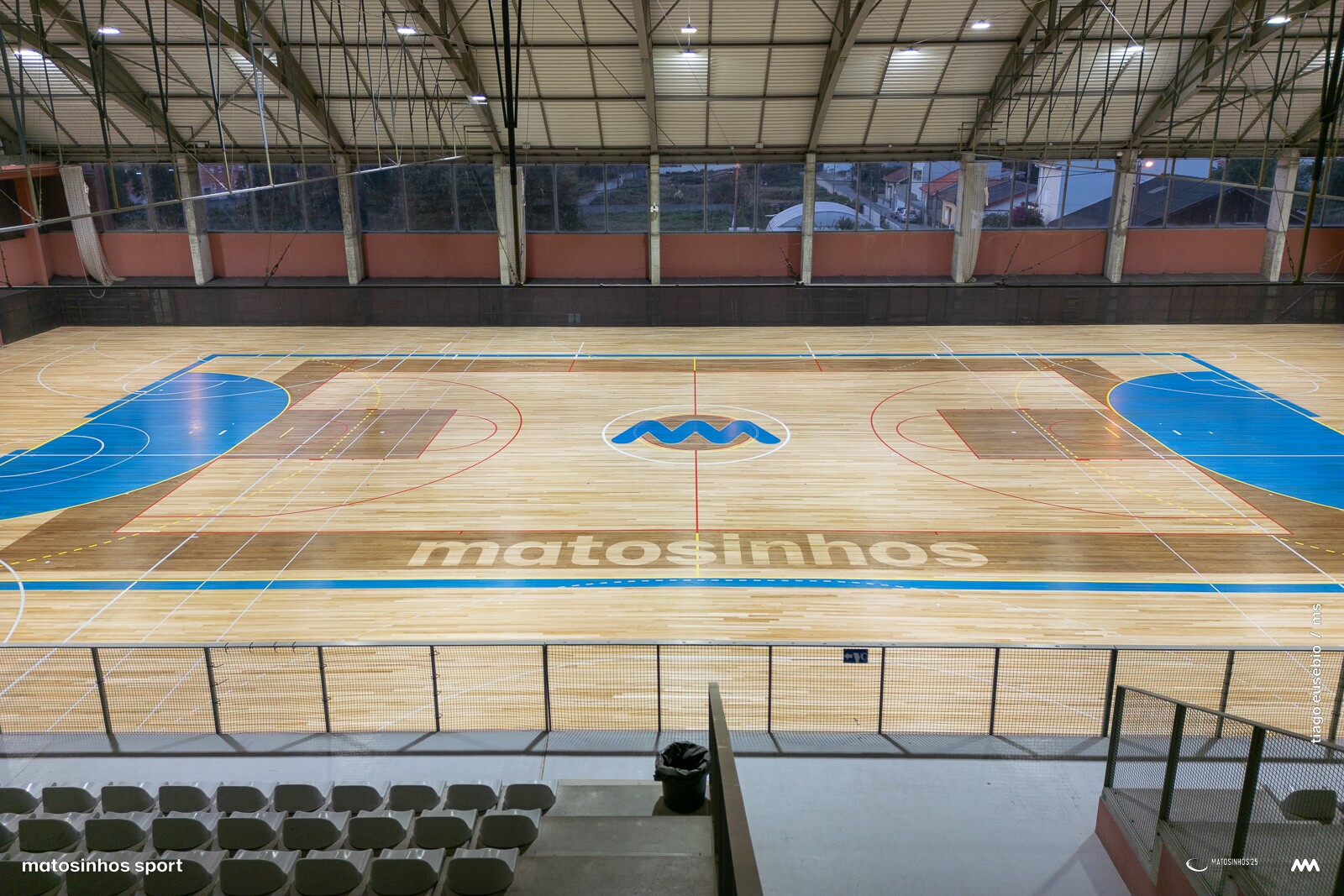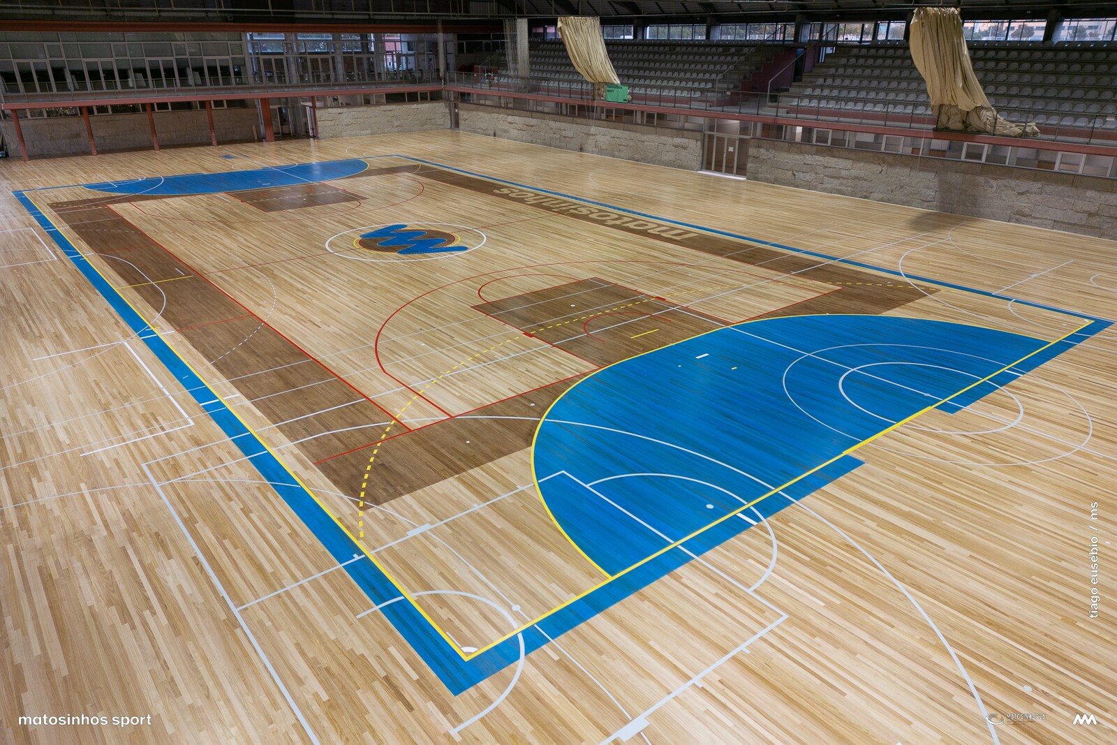 Terminou a empreitada da substituição do piso desportivo com a aplicação de mais de 2.200 metros quadrados de eucalipto "Eucalyptus globulus", identificada ao centro pelo nome e marca do concelho.